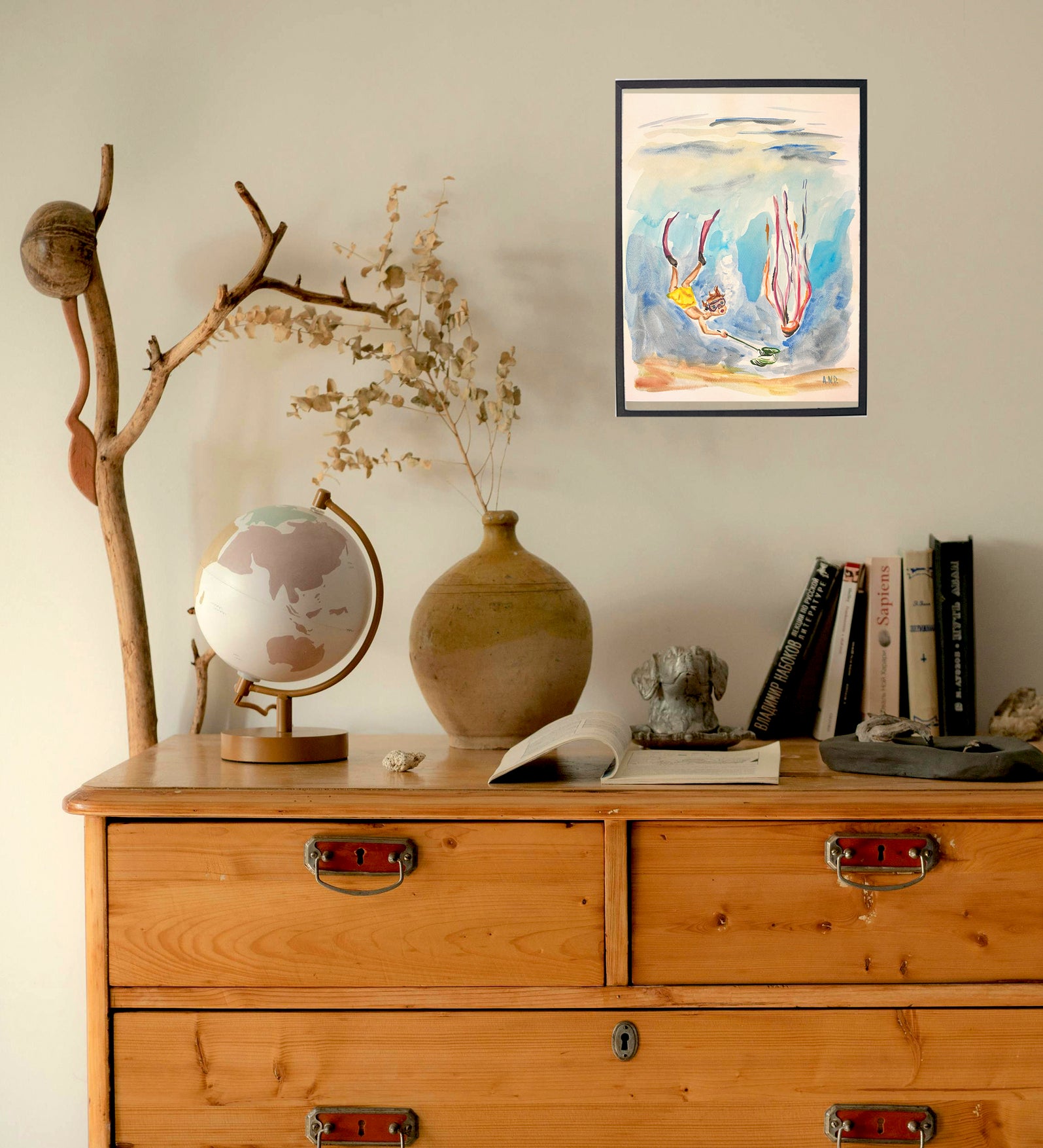 Una acuarela con un trazo muy propio, divertido, cercano y real. Con las aguas en calma y en la profundidad, el chico intenta cazar a la medusa que yace tranquila en el mar. Las tonalidades, los movimiento de los personajes o las líneas transmiten tranquilidad y calma. Disfruta de las profundidades del mar desde tu hogar.