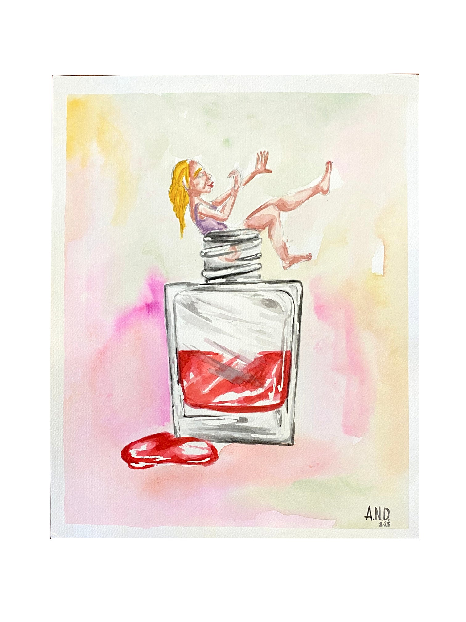 Una de mis obras más divertidas y creativas. Te presento a la niña que se pinta las uñas. He fusionado el bote dando un cómodo asiento mientras espera. Con un fondo relajado que trasmite que es su momento de cuidados, que nadie la moleste. Esta acuarela es cálida, divertida y llena de imaginación, el mejor regalo que puedes hacer estas Navidades.